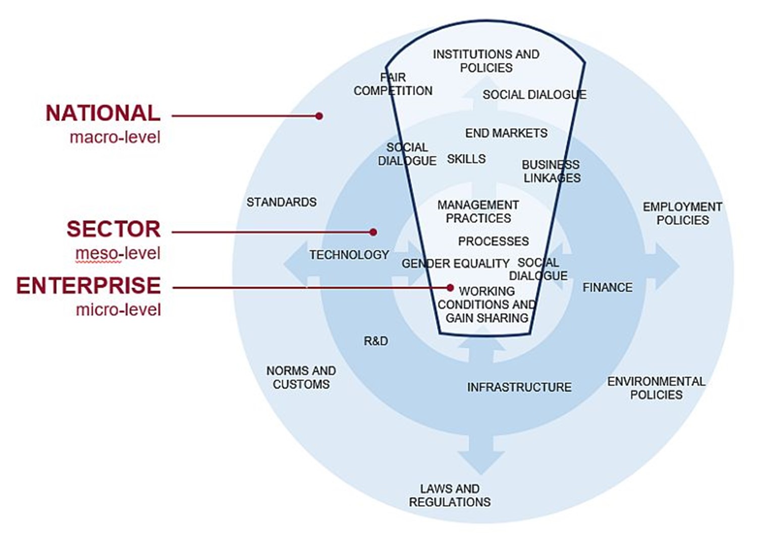 Therefore, rather than using a “one size fits all” approach or intervening at a single level, the Programme will address productivity and decent work deficits across policy, sector and enterprise levels for win-win solutions that improve productivity and that ensure, through social dialogue and workplace cooperation, that gains are distributed equitably. For this purpose, the Programme will select a “slice” of the local productivity ecosystem, i.e. a sector and associated segment of the overall ecosystem in which the potential for productivity growth and decent job creation are aligned with feasibility to intervene.
